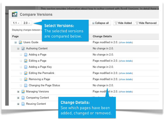 Comparing two versions of documentation or even the content of two entire spaces is a piece of cake with Scroll Versions. Select the versions you want to compare and see what has changed.