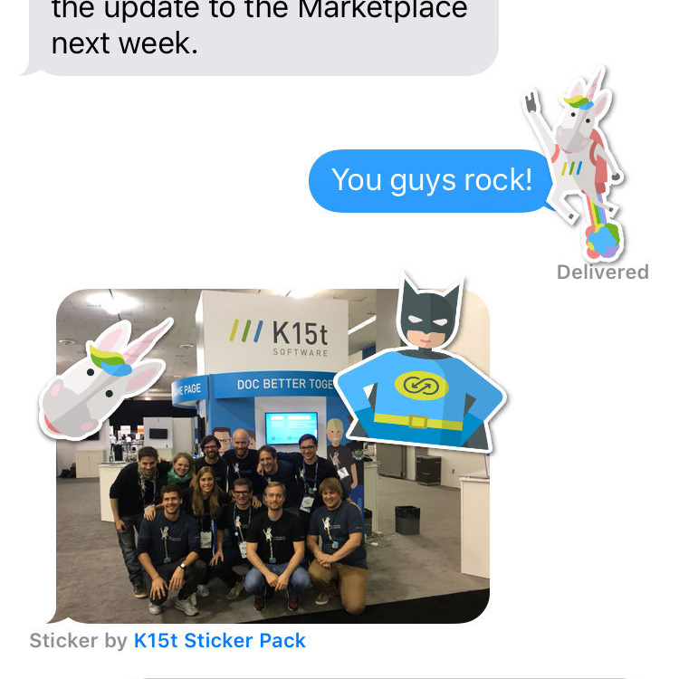 But wait, there is more: At the end of a successful year, we want to thank you for collaborating with us by sharing a little bit of cheer: K15t Software is proud to present you with a free sticker pack for iMessage and Telegram featuring our rocketcorn mascot.