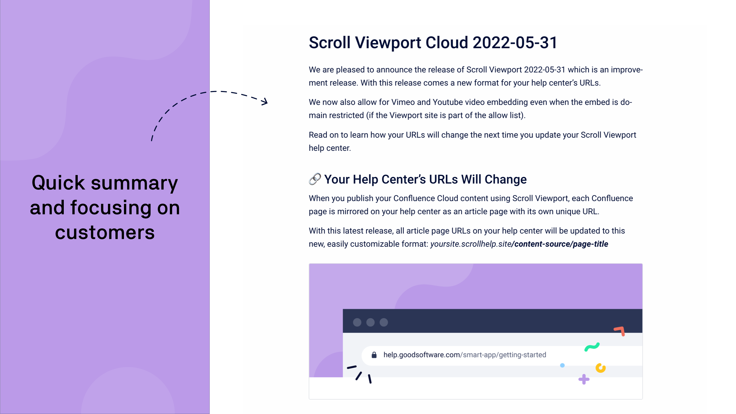 At K15t, we use a combination of these channels while communicating release notes to our customers. While the exact mix depends on the size of the release, we always make it a point to add release notes to our help center with each update. Our customer-facing help center is built on Scroll Viewport for Confluence Cloud which lets us collaboratively create the content in Confluence and presents it in the form of neat and structured release notes in our online help center. This ensures that our customers stay updated about all small and big changes in the product at all times.